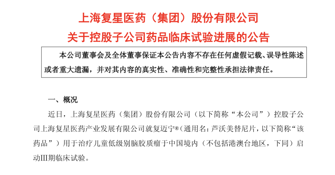 7月9日,复星医药(600196.SH;02196.HK)宣布,自主研发的MEK1/2选择性抑制剂复迈宁®(通用名:芦沃美替尼片,以下简称“该药品”)用于治疗儿童低级别脑胶质瘤(pLGG)适应症于中国境内(不包括港澳台地区)启动Ⅲ期临床试验。