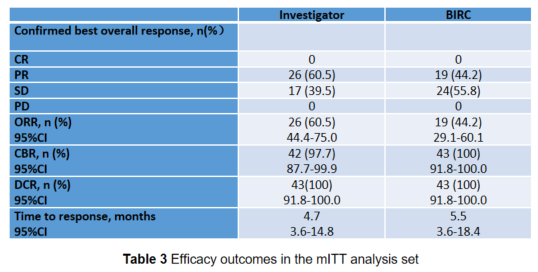 在43例可评估患者中,BIRC评估且确认的 ORR 为44.2%(95% CI:29.1-60.1),19 例达到PR,24 例达到SD,无患者疾病进展。