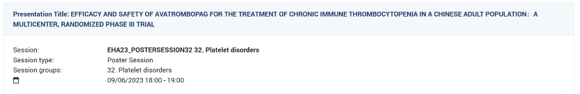 EHA2023|The results of phase III study of Avatrombopag for the treatment of Chinese adults with chronic primary immune thrombocytopenia was released!