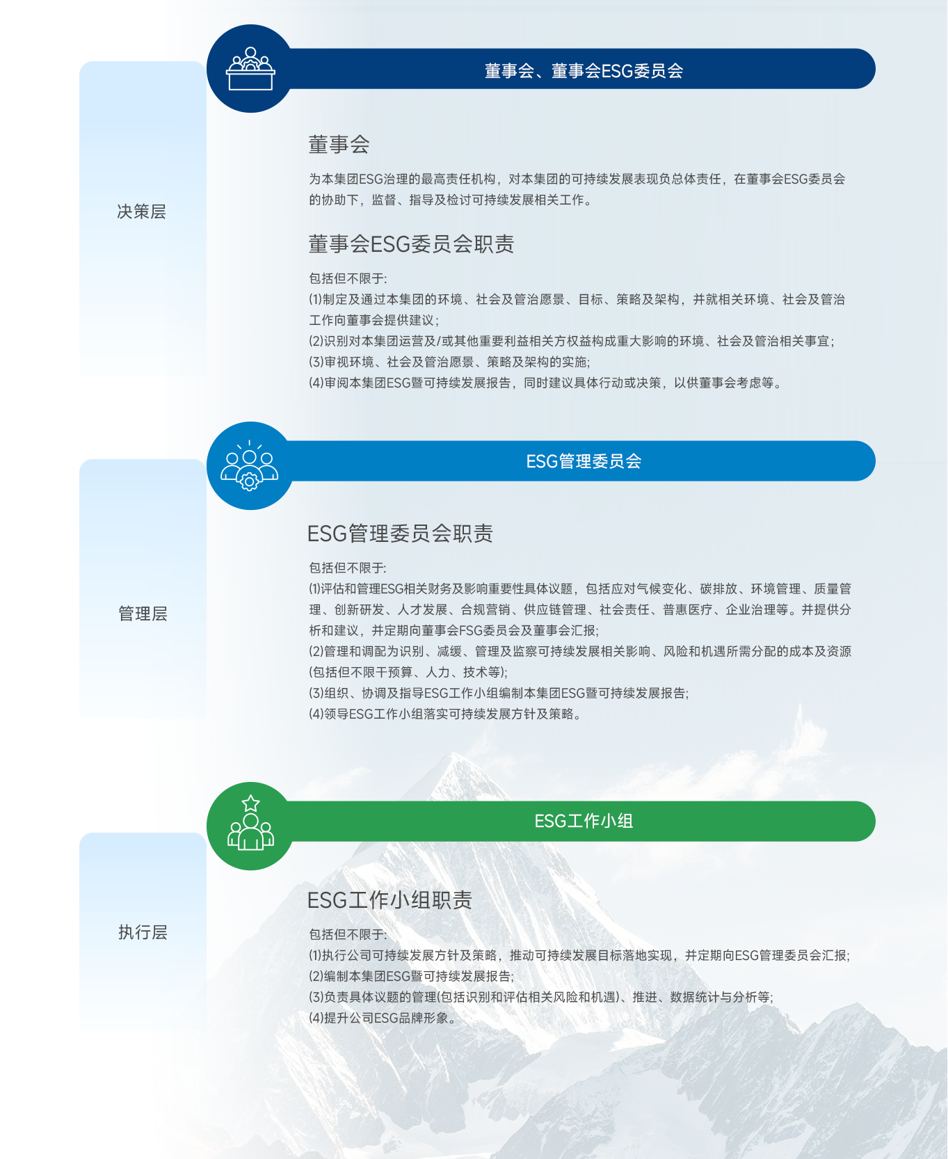 复星医药集团构建了由董事会及董事会ESG委员会、ESG管理委员会、ESG工作小组组成的ESG治理架构,以确保董事会及管理层对可持续发展的有效监管、科学指导及全力支持。
