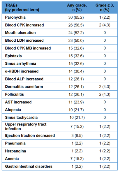 与研究药物有关的不良事件(TRAEs)发生率为 97.8%,以 1-2 级为主,≥3 级 TRAEs 仅占21.7%,常见不良事件主要包括甲沟炎(65.2%)、血肌酸磷酸激酶(CPK)升高(56.5%)、口腔溃疡(52.2%)和血乳酸脱氢酶升高(50%),均为 MEK 抑制剂类药物常见可控性反应。
