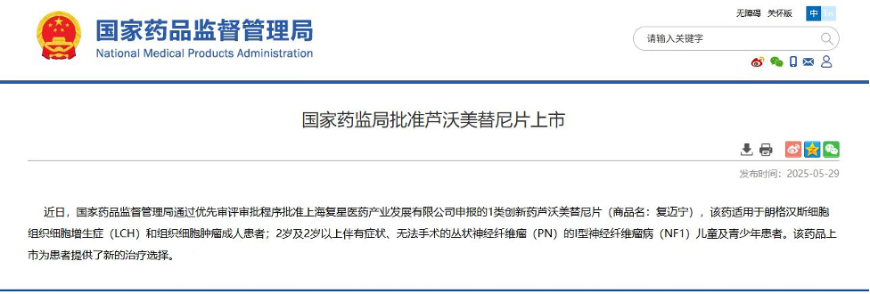 (2025年5月29日,中国上海)5月29日,复星医药(股票代码:600196.SH;02196.HK)宣布,自主研发的1类新药芦沃美替尼片(商品名:复迈宁®;项目代号:FCN-159)正式获得国家药品监督管理局(NMPA)批准上市。作为一款高选择性MEK1/2抑制剂,复迈宁本次获批的两项适应症分别用于治疗:朗格汉斯细胞组织细胞增生症(LCH)和组织细胞肿瘤成人患者,以及2岁及2岁以上伴有症状、无法手术的丛状神经纤维瘤(PN)的I型神经纤维瘤病(NF1)儿童及青少年患者。复迈宁的双适应症获批填补了相关罕见肿瘤领域的治疗需求,为患者提供了新的治疗选择。