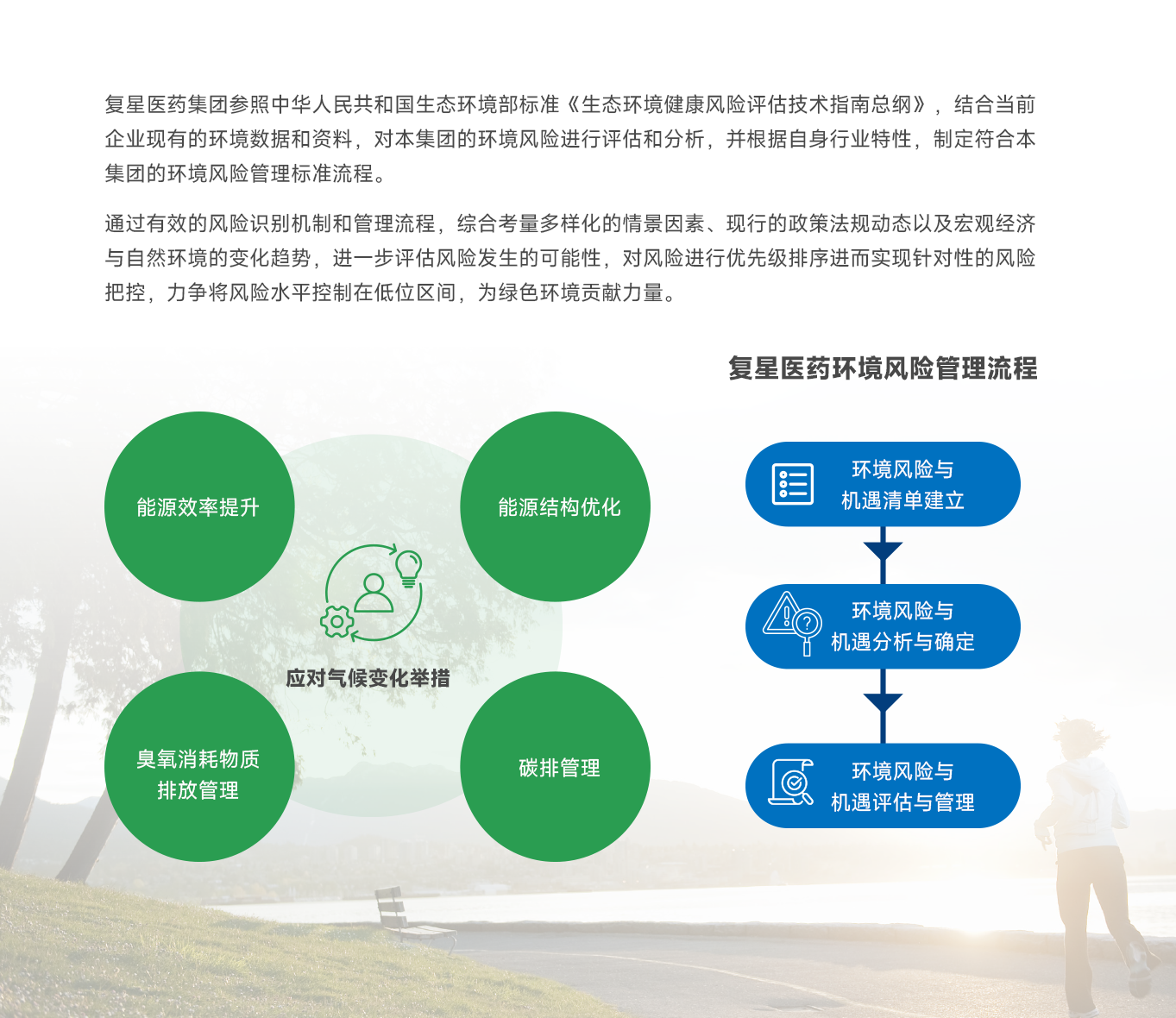 复星医药董事会为“应对气候变化”和“环境管理”议题的最高责任机构,由ESG管理体系全面负责议题的监督、决策、管理和执行。同时,本集团已将“应对气候变化”和“环境管理”相关目标与指标纳入高级管理层绩效考核书中。